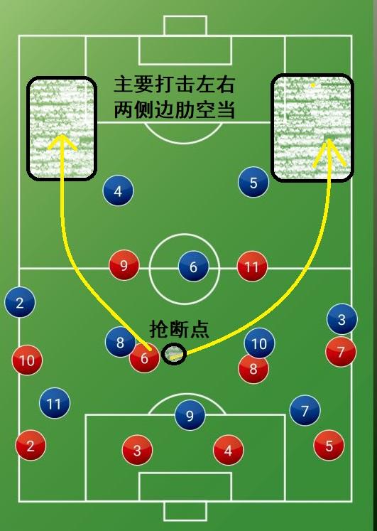 当控球一方大举压上,压过防守一方的半场时,左右两名边后卫已经完全脱离了自己的防守区域,这时采用防守反击战术的球队在抢断后就可以着重打击进攻方两名边后卫身后的空当,也就是我们常说的边肋区域空当。