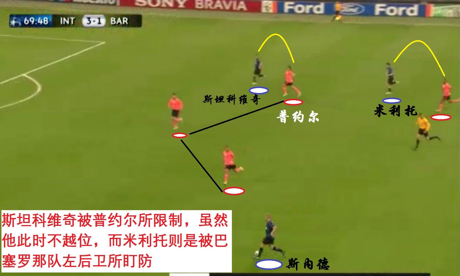 如上图所示,此时斯内德面临着艰难的选择,他可以将球传向已经在高速前插路上的斯坦科维奇,也可以选择将球传给斯坦科维奇身后的米利托。但是我们能够看到这两名球员都被巴塞罗那队的左中卫及左边后卫所紧紧盯防,一旦球传出,将有很大的概率被普约尔所拦截。