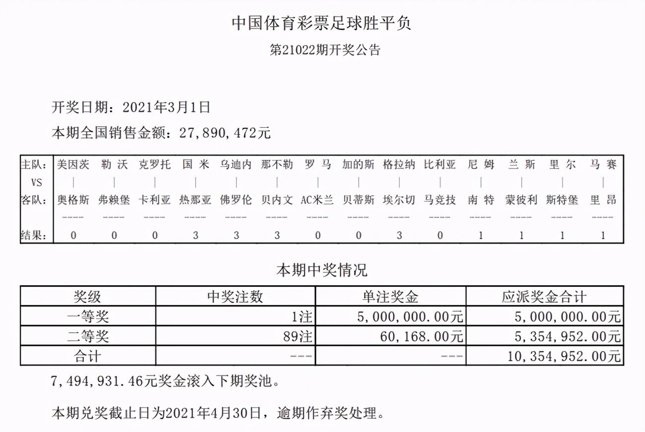 北京时间3月1日,胜负彩第21022期开奖结果揭晓。本期一等奖仅开1注,单注奖金500万元,749万余元奖金滚入下期奖池;二等奖开89注,单注奖金6万余元;任九头奖开1190注11591元。本期胜负彩销量为27,890,472元,任九投注总额21,553,030元。