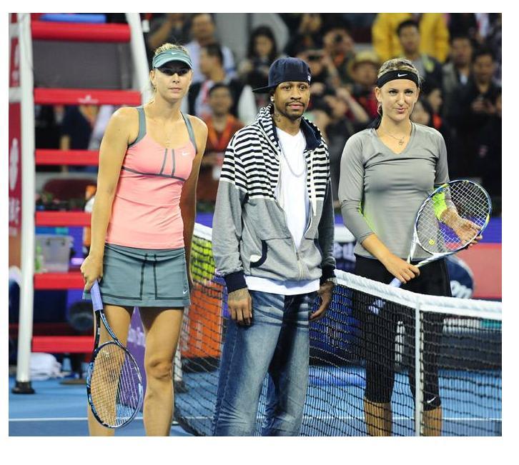 如果贝克汉姆的身高难以确定,我们还有一道保险,就是身高1.83米的阿扎伦卡。艾弗森曾在网球场上和1.88米的沙拉波娃以及阿扎伦卡有过合影,显示他和阿扎伦卡高度相仿,而且比莎拉波娃矮的也不太多。如果艾弗森只有1.78米,应该比莎娃矮半头。