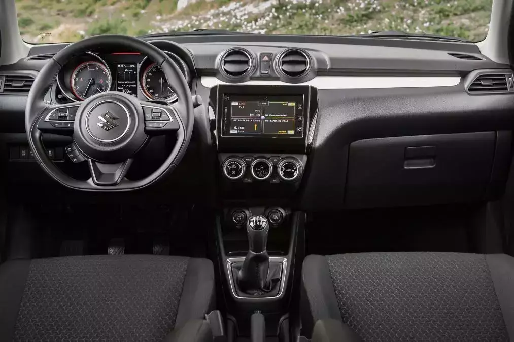 外观部分,第六代Swift的前脸采用了六边形进气格栅搭配更具侵略性的前保险杠,车身侧面则营造出了悬浮式车顶的视觉效果。内饰方面,新车采用层次感更足的设计语言,并且继续采用深色配色,双炮筒式仪表盘中的红光点缀增加了运动感。