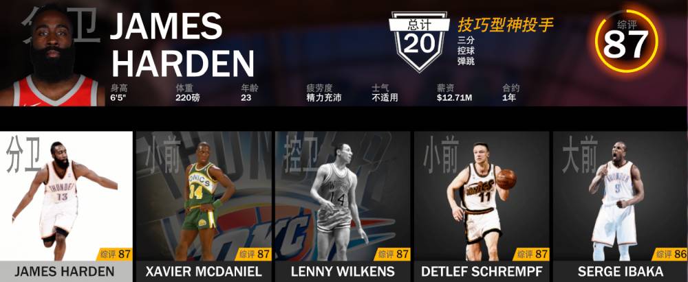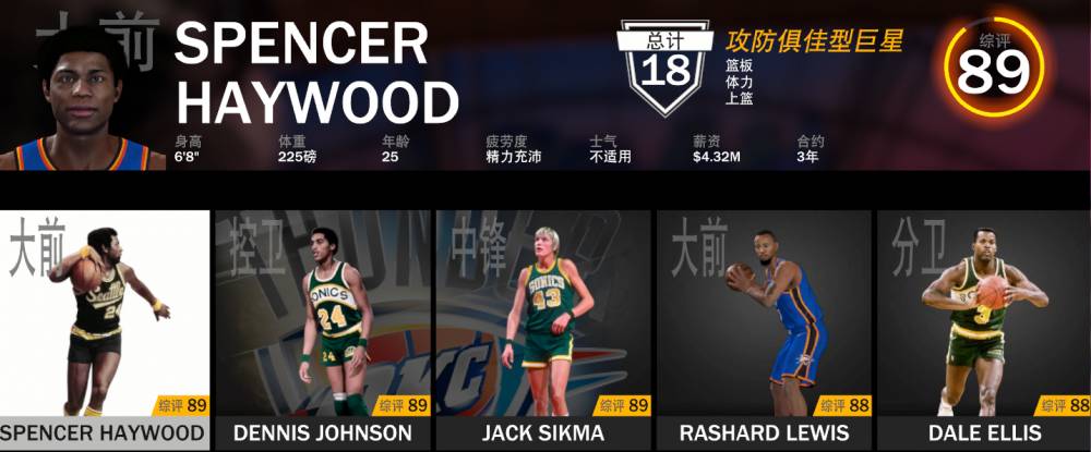 替补:斯宾塞-海沃德 (89)、丹尼斯-约翰逊 (89)、杰克-西克马 (89)、拉沙德-刘易斯 (88)、戴尔-埃利斯 (88)、詹姆斯-哈登 (87)、泽维尔-麦克丹尼尔 (87)、兰尼-威尔肯斯 (87)、德特雷夫-施拉姆夫 (87)、塞尔吉-伊巴卡 (86)