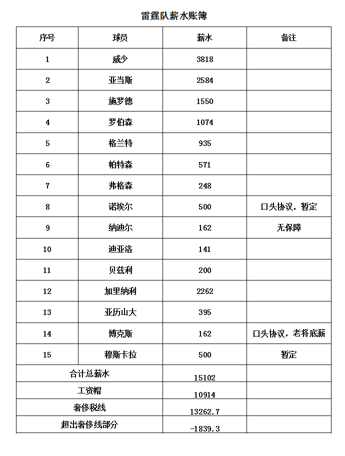 上面是15人的薪水账簿,总薪水超过1.5亿美元,超出奢侈税线1839.3千万美元,前NBA球员,现任NBA评论员帕金斯认为雷霆队老板绝对不想再付奢侈税!
