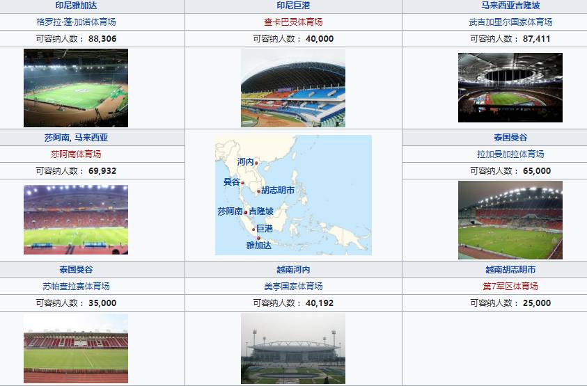 本届赛事在四个国家的6个城市的7个体育场举办,分别是印尼雅加达的蓬-加诺球场、印尼巨港的查把卡灵体育场、马来西亚吉隆坡的伍吉加尔体育场、马来西亚的莎阿南体育场、泰国曼谷的拉加曼加拉体育场、泰国曼谷的苏帕查拉赛体育场、越南河内的美亭国家体育场以及越南胡志明市的第7军区体育场。
