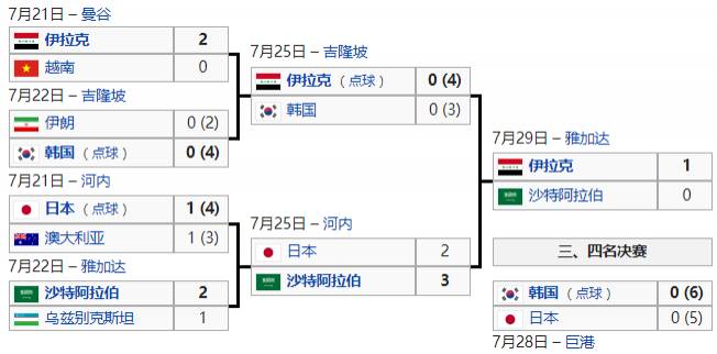 在四强对决中,伊拉克再度上演神奇,他们120分钟内与韩国0-0战平,在点球大战中4-3取胜对手;日本队虽然表现出了足够的韧劲,在两度落后的情况下短时间追平比分,但他们还是2-3负于沙特。