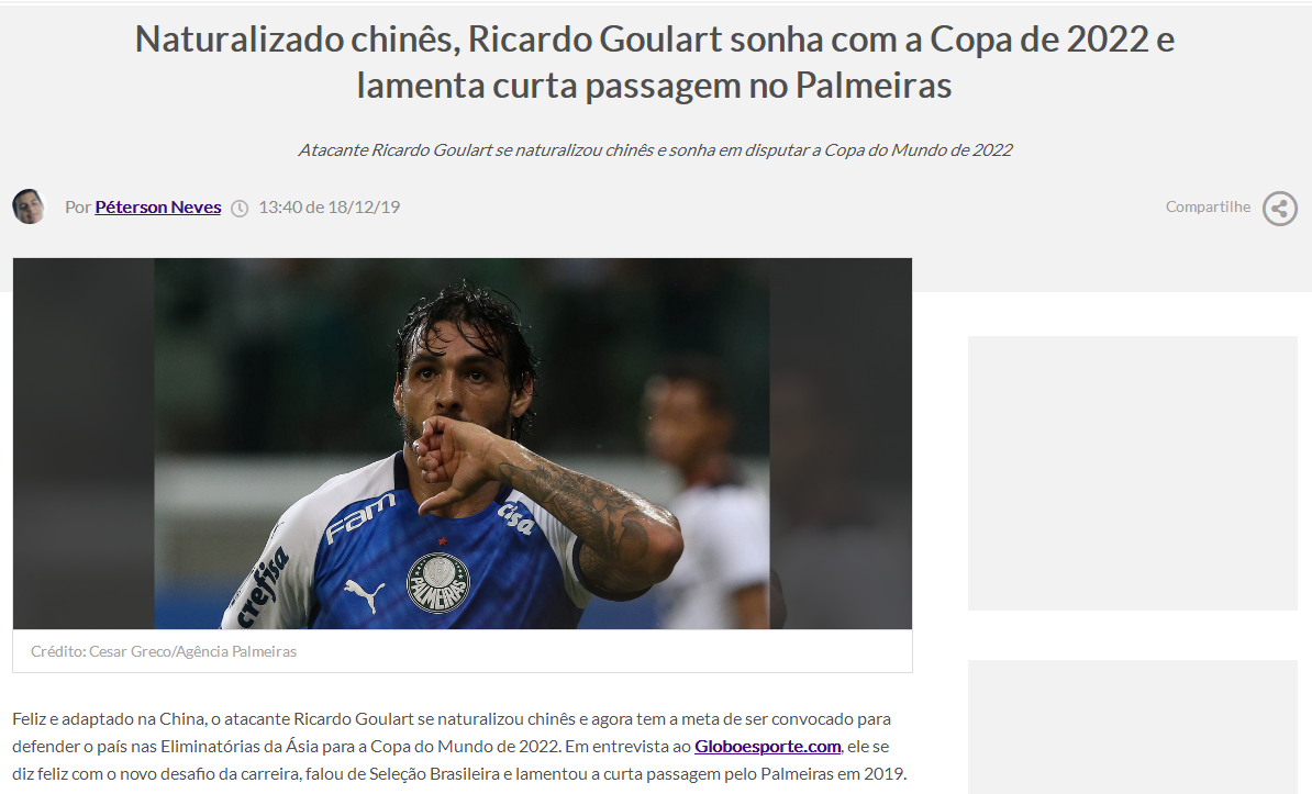 根据巴西环球体育等多家媒体的消息,巴西球员高拉特已经完成入籍,目前已经具备了代表中国队出场的机会。他本人也在接受采访时确认了这一消息,并承诺会尽力帮助国足冲进2022年世界杯。 他将是继艾克森之后第2位非华裔归化球员。