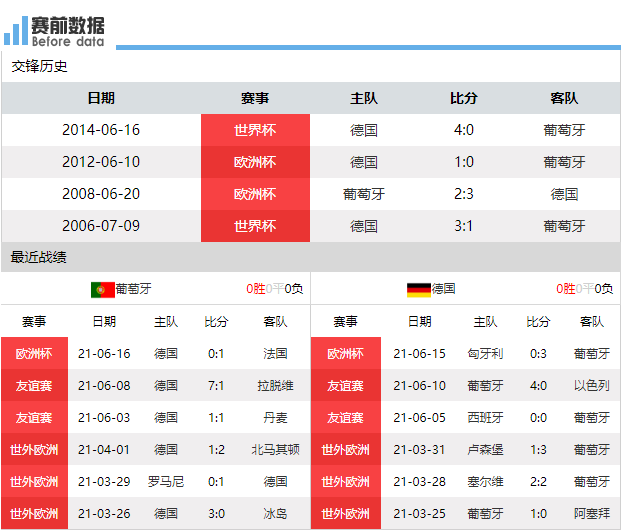 双方近4次交手,德国4战全胜 ,最近2次对阵葡萄牙都保持零封。葡萄牙各项赛事近6场比赛4胜2平保持不败;德国方面,各项赛事近6场比赛4胜1平1负;两队防守都比较稳定,此役将会考验双方的进攻实力,进攻端葡萄牙的星味更足。