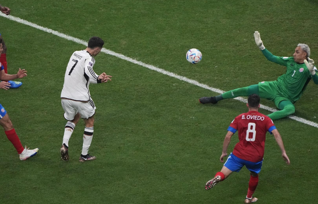 哥斯达黎加领先后仅仅两分钟,德国队中路进攻,哈弗茨扛住哥斯达黎加中后卫射门,再度扳平比分,哥斯达黎加2-2德国。