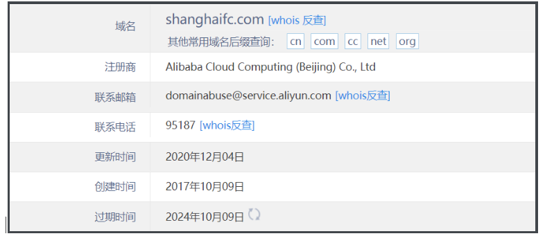 因为,我们通过对上海上港官网新域名进行查询。发现,这个域名是在2017年进行注册的,而最近的更新时间是2020年12月04日。这个更新如果没猜错的话,应该就是做了域名解析或跳转,因此才来跳转到现在上海上港的官网。