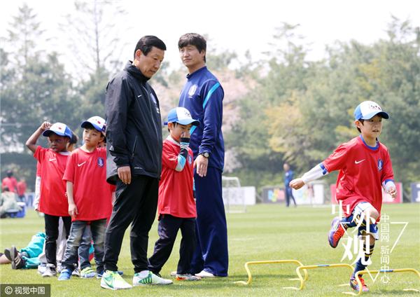 2013年5月5日,韩国,当天是韩国国内的儿童节,韩国国家队教练球员走进校园指导小朋友踢球。(视觉中国)