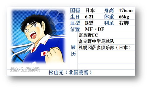 松山光初次登场就给了留下极其深刻的印象,一个人护住足球抵御了对方数人的逼抢,直至比赛结束。他与日向小次郎之间的抗争也是动漫中非常精彩的剧情,似乎只有他敢直面日向小次郎的逆鳞,坚韧不拔就是他的代名词。而他真正的属性,除了是一名斗志顽强的防守球员外,还是深受队友们的信任的队长。