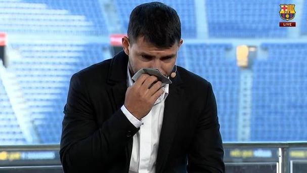 阿圭罗在发布会上数次哽咽。直播截图