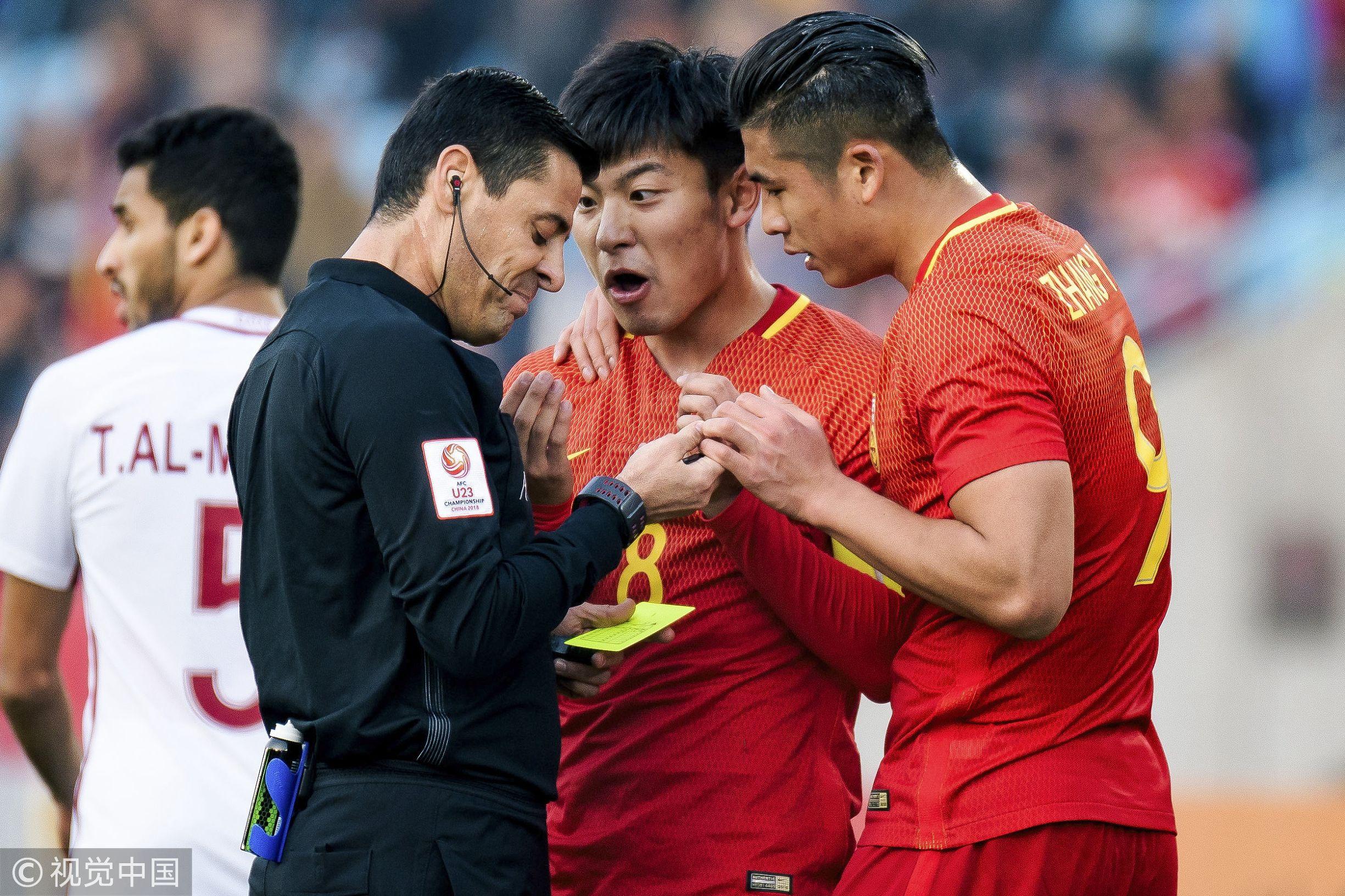 比赛第22分钟,中国队何超前场反抢时被吹罚犯规,吃到黄牌。比赛第41分钟,中国队何超后场防守时放倒对手前锋,吃到本场比赛第二张黄牌被罚离场,张源向裁判抱怨同样吃到黄牌。何超被罚离场后,卡塔尔抓住人数上优势扳平比分。比赛第46分钟,刘奕鸣防守时踢到对方球员吃到黄牌。比赛第57分钟,韦世豪防守时战术犯规吃到黄牌。比赛第63分钟,李晓明向裁判抱怨吃到黄牌。全场比赛中国队共被出示7张黄牌1张红牌,而卡塔尔队仅1张黄牌。犯规数双方21比18,卡塔尔队仅比中国少了3次。最终中国U23男足1-2不敌卡塔尔U23男足,未能小组出线。