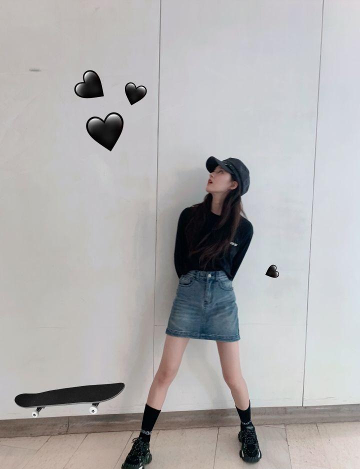 她搭配了红白配色的老爹鞋,和卫衣上下呼应同时给人感觉十分干净。这种上衣和鞋子色彩呼应、中间短裙作为过渡的搭配手法实用又时髦,直男也忍不住爱上