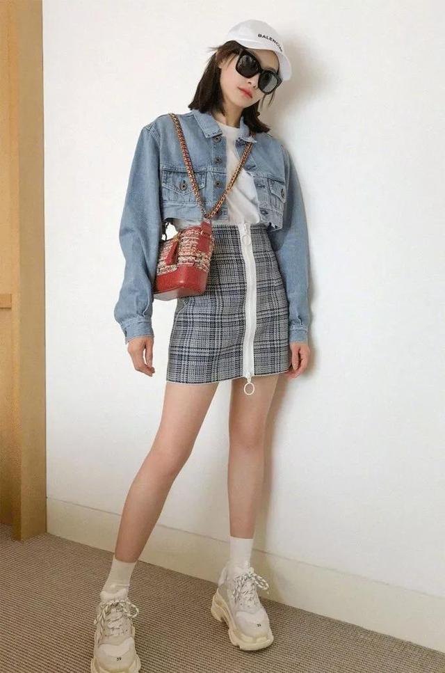 超短款的牛仔夹克超级时髦,搭配黑色格子半身裙是又酷又魅,裙子中间的白边拉链和白色内搭还有白色老爹鞋和谐地融为一体,红色斜挎包是整个造型的点睛之笔,独特的背法时尚度马上upupup,整个人看起来青春又帅气。