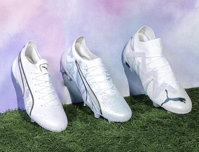 3 月 22 日,PUMA 正式发布专为女子足球运动员打造的全新“光辉套装”,当中有 FUTURE、ULTRA 及 KING系列鞋款,它们采用清新素雅的白色鞋身主色,同时搭配了青紫色涂装纹理。