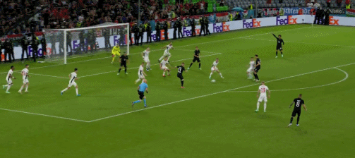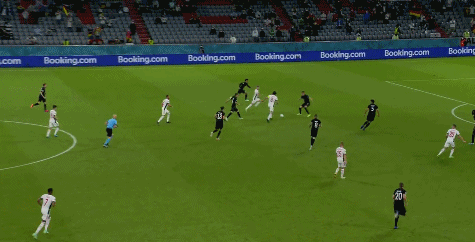下半场比赛开始,匈牙利队开球。第46分钟,格纳布里禁区内接队友过顶长传,停球后闪开空档打门,被防守队员挡出。第51分钟,萨内边路横传,哈弗茨禁区前停球后转身直接射门,被古拉西奇没收。第54分钟,基米希右侧任意球罚入禁区,匈牙利队防守队员解围出来,克罗斯头球吊入禁区后再次被解围,吕迪格凌空打门被挡出底线,不过裁判吹罚德国队队员犯规在先。