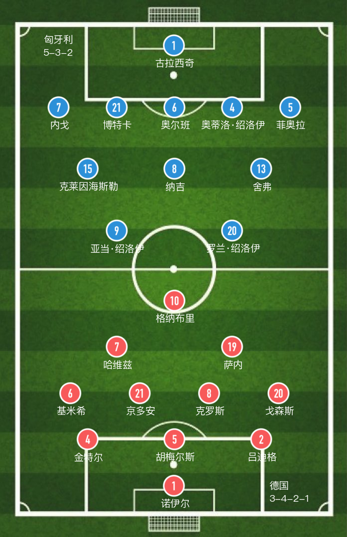 下半场补时4分钟,双方再无建树。最终亚当·绍洛伊一传一射,哈弗茨和格雷茨卡建功,德国队2:2战平匈牙利。