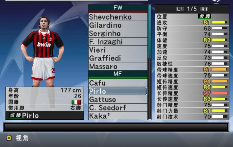 06到07赛季,AC米兰复仇利物浦勇夺欧冠冠军、欧洲超级杯、世俱杯三项冠军,卡卡更是夺得世界足球先生。而这一年皮尔洛已经28岁了。在游戏里他的各项数据都没有太大的变化,依旧拥有超高的中场数值。