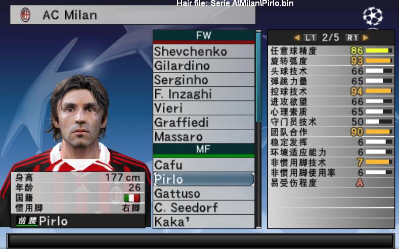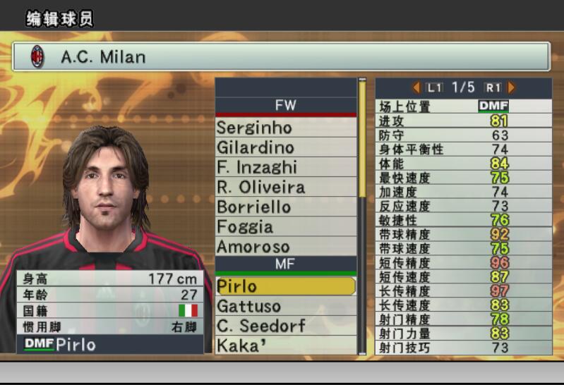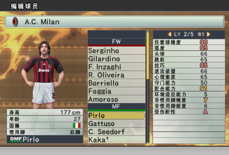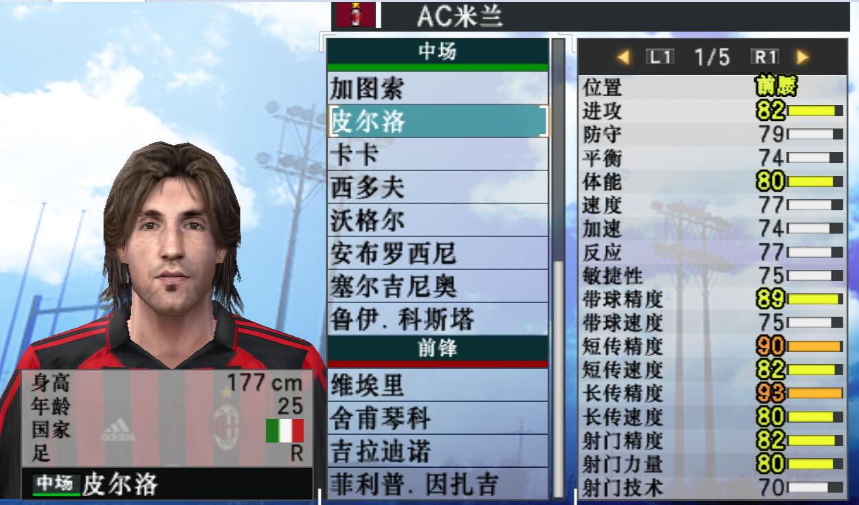 皮尔洛的足球生涯是在自己家乡的球队布雷西亚起步的,经过国米一年的碌碌无为,还有短暂的租借生涯,于2001年22岁的时候,加盟了AC米兰,在这里奉献了自己10年最美好的足球青春。而实况足球8发布的2004年,这一年皮尔洛25岁,在这之前已经帮助AC米兰夺得了欧冠冠军、意大利杯、联赛冠军等诸多荣誉,他和加图索组成的中场组合也是当时世界上最出色的中场组合。而在游戏中的短传精度、长传精度、控球技术都超过了90的数值。