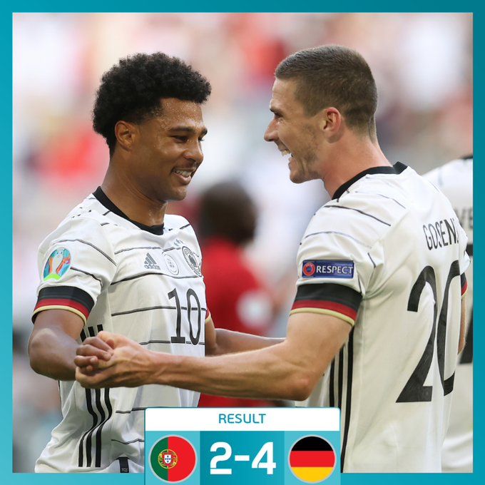 2020欧洲杯F组第二轮,葡萄牙对阵德国,在C罗率先破门的情况下,德国人连扳4球,最终4比2取胜卫冕冠军,收获本届欧洲杯首场胜利。