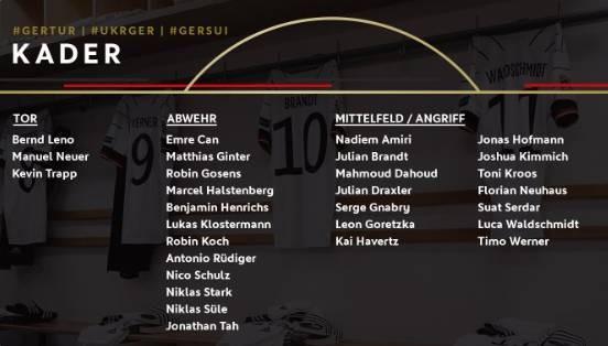 努贝尔没有获得这场比赛的球衣号码。如果纳格尔斯曼最终决定带4名门将参加欧洲杯的比赛,那么科赫、拜尔和菲里希将面临被排除在最终名单之外的危险。