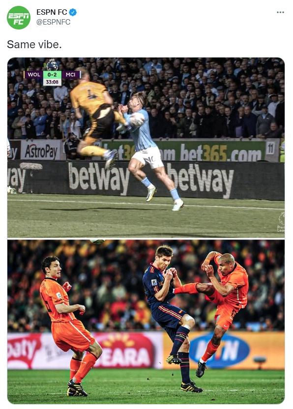 直播吧9月17日讯 英超第8轮,曼城vs狼队,比赛上半场第33分钟,柯林斯飞踹格拉利什,被直红罚下场。ESPN也晒出柯林斯飞踹格拉利什与德容飞踹阿隆索对比图,并配文:一样的气势。