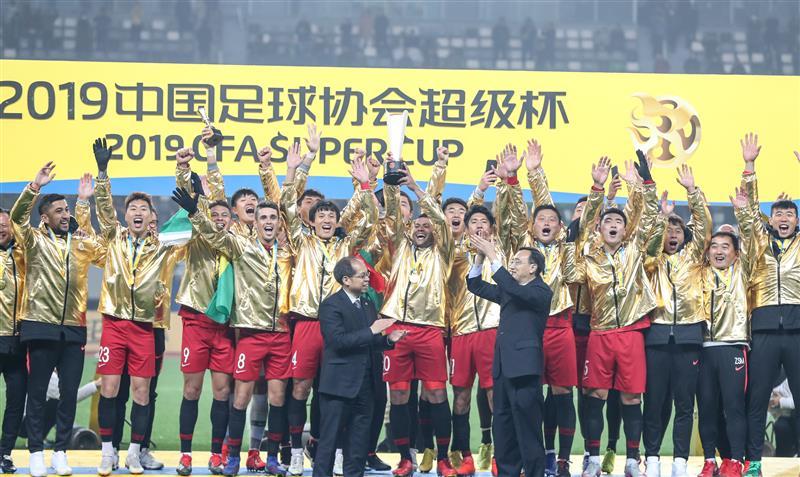 2019年2月23日,上海上港队球员胡尔克(中)在颁奖仪式上举起奖杯庆祝。 当日,在江苏苏州举行的2019中国足球协会超级杯赛中,上赛季中超联赛冠军上海上港队以2比0战胜足协杯冠军北京国安队,夺得冠军。 新华社记者杨磊摄