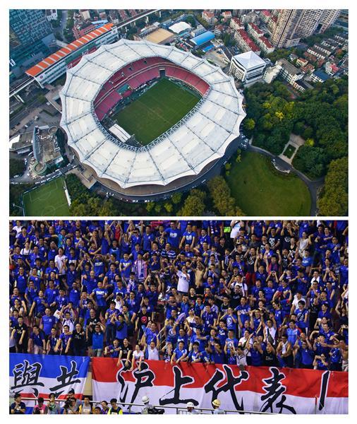 这张拼版照片显示的是:2015年11月12日航拍的位于上海虹口的中国第一个专业足球场虹口足球场全景(上图);2015年7月27日,球迷在虹口足球场为申花队助威(下图)。 新华社发