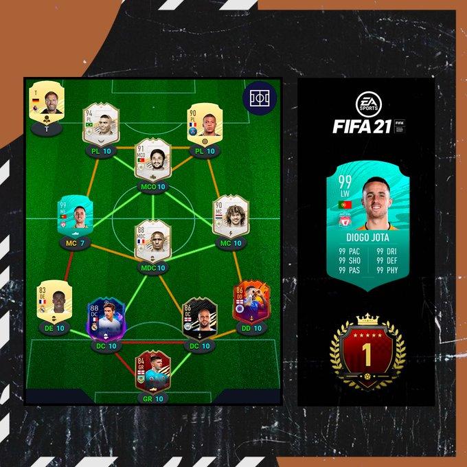 若塔的FIFA21阵容,除了一张能力值为99的自己的专属球星卡外,还包括4张传奇卡,分别是大罗、尤西比奥、古利特和维埃拉,折位球员在游戏中都非常好用,也可以看出若塔深谙此道。