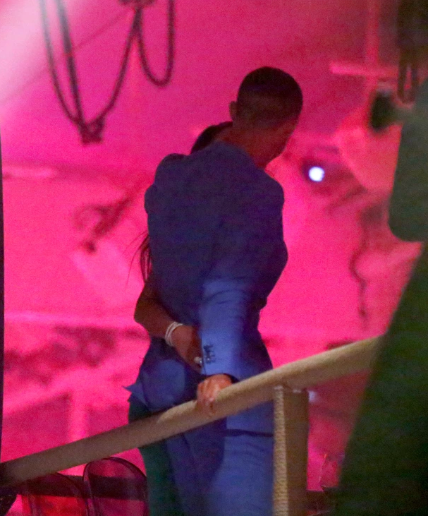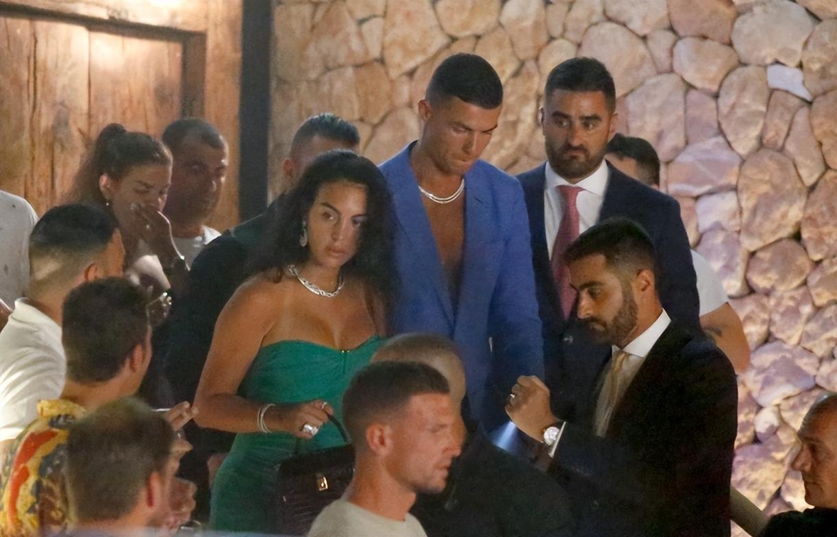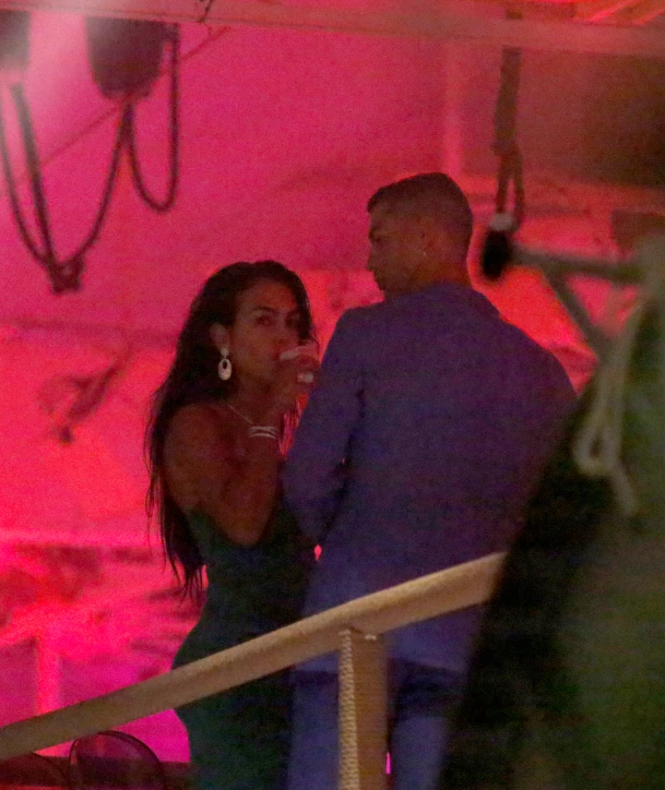 到了晚上,C罗和乔治娜上岸,现身伊维萨岛上一家夜店。C罗身穿一套深蓝色深V西装,乔治娜身穿绿色无吊带抹胸连衣裙,两人脖子上的银项链颇有情侣款的感觉。