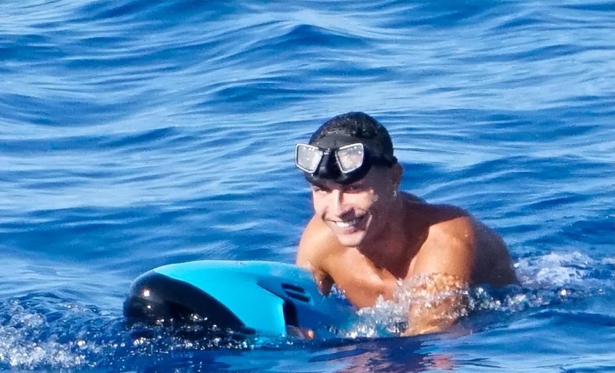 C罗头戴棒球帽,身穿泳裤,他的腹肌在假期也非常明显,可见在度假期间没有放纵自己,而是保持着自律。两人在游艇上晒太阳以后下水潜泳,不亦乐乎。