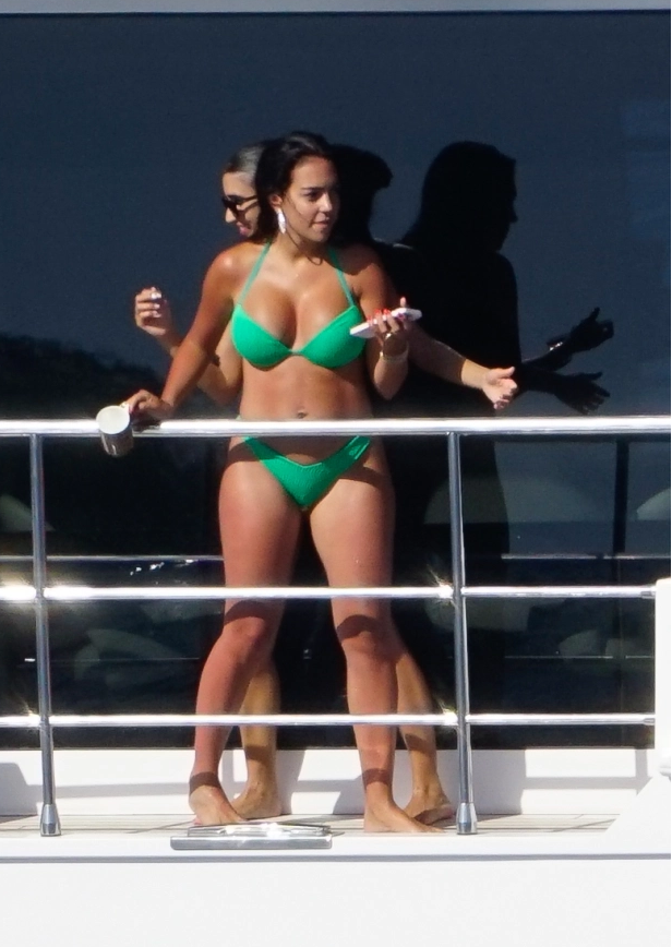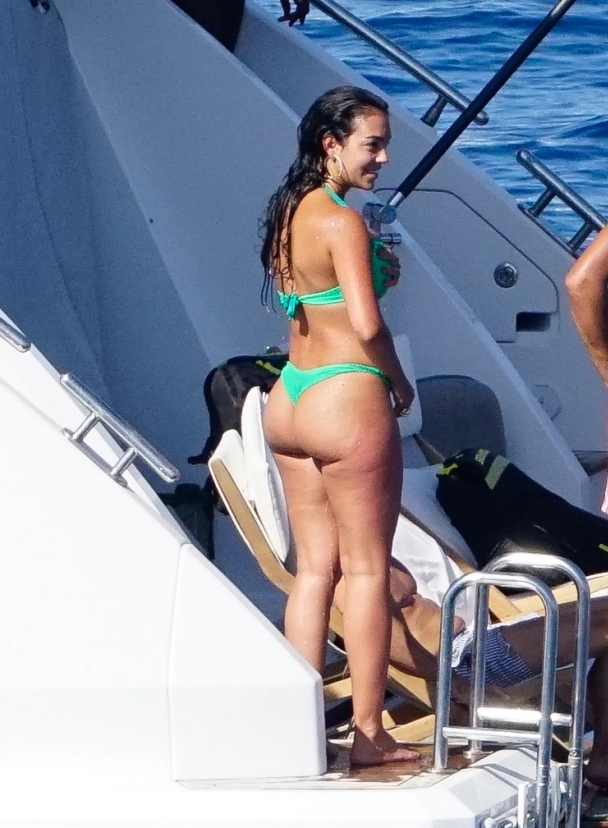 乔治娜身穿一套绿色比基尼亮相,上衣仅用一根布条系在背后,下装也是省布料的丁字裤。这套比基尼最大程度展示了乔治娜的妖娆身段。
