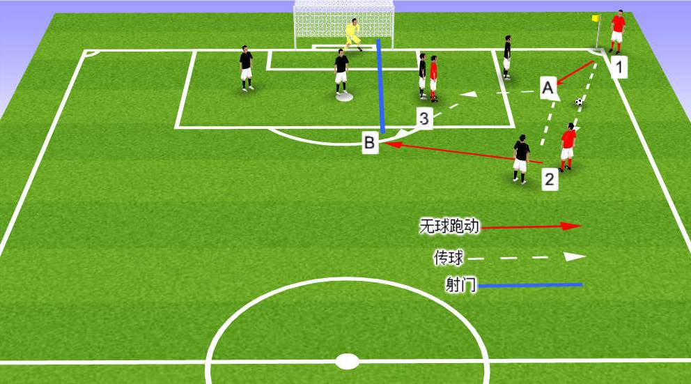 3、1号球员跑到A点不越位的位置,2号将球回传给1号,立刻跑到B点;