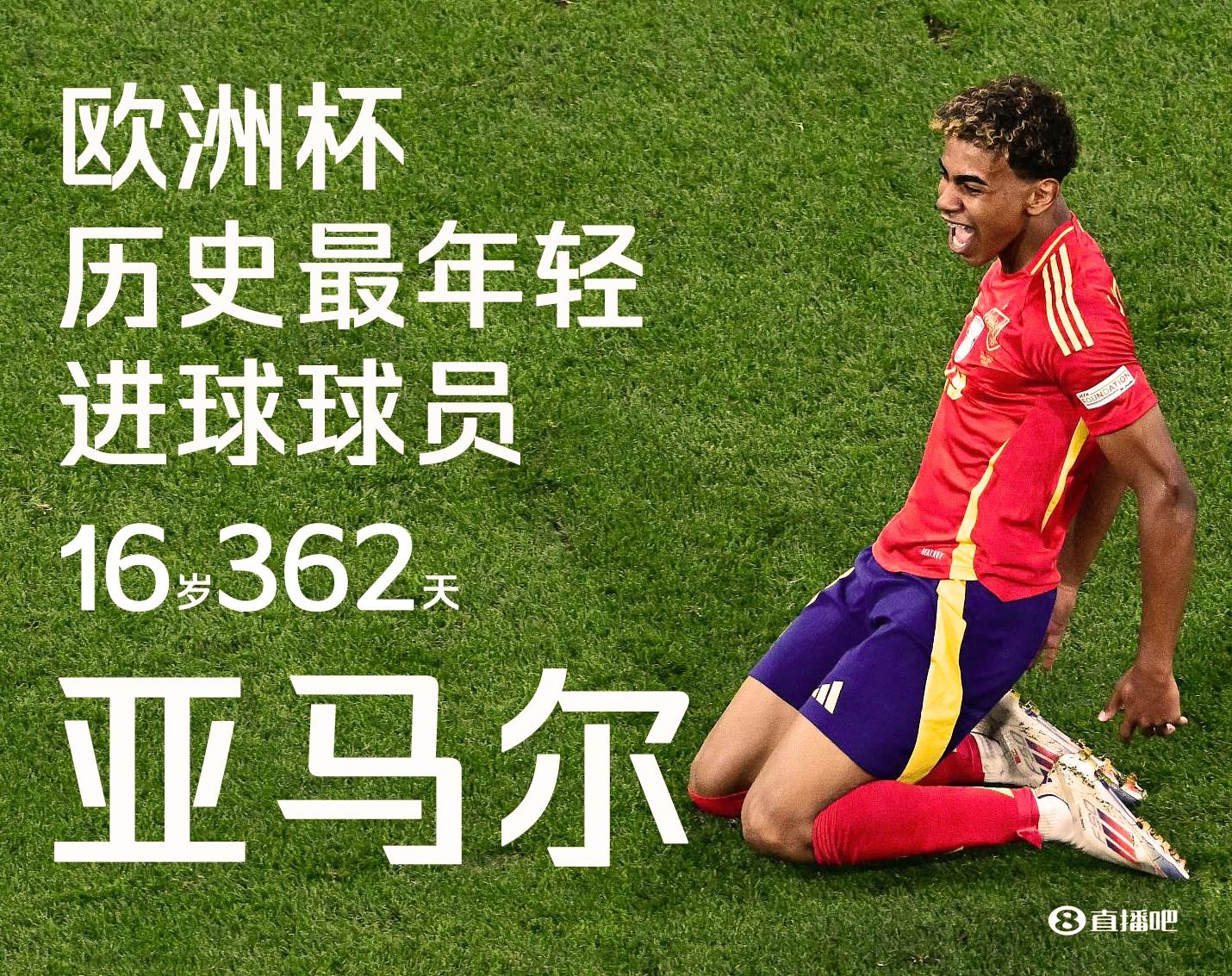 欧洲杯历史最年轻进球球员纪录:亚马尔(16岁362天,西班牙 2-1法国)