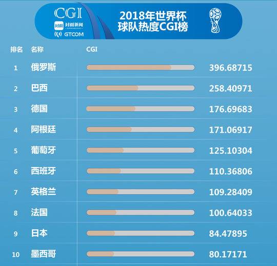 为了彻底解决这个问题,让更多球迷少去一趟天台思考人生。7月2日,封面新闻、中译语通和封面智库联合发布了《2018世界杯球队热度CGI榜》,根据球队在全球各大媒体以及社交网站上的搜索量、讨论量、情感倾向等数据,对本次世界杯32支参赛球队的关注度进行了评估排名,为球迷提供一个不错的冠军预测依据。