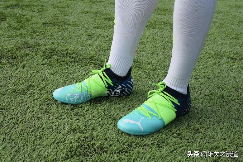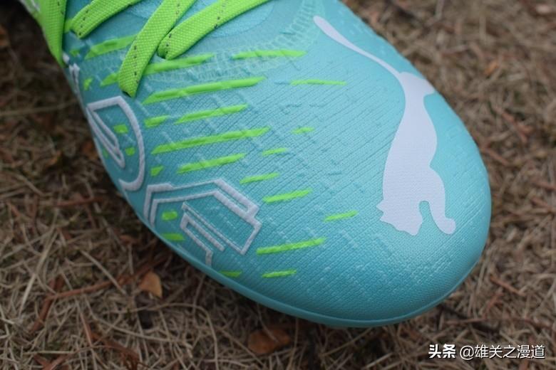 这款Puma Future Z 1.2 MG足球鞋松石绿、眩光绿、海军蓝三段式拼接配色设计在球场上非常显眼,辨识度极高。鞋头 “PUMA”logo和内侧“FUTURE”字样,品牌元素和鞋款的呈现方式非常直接。