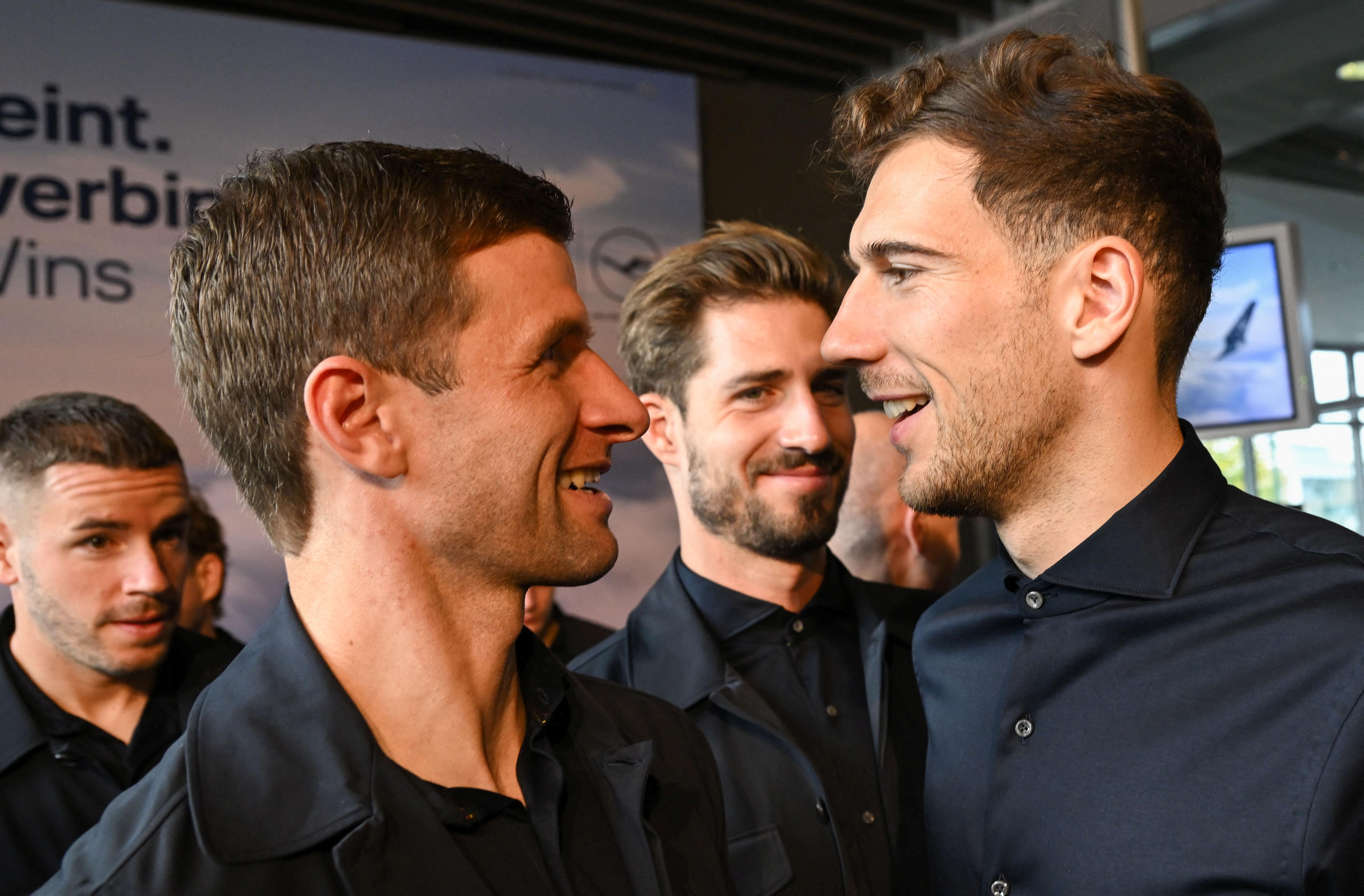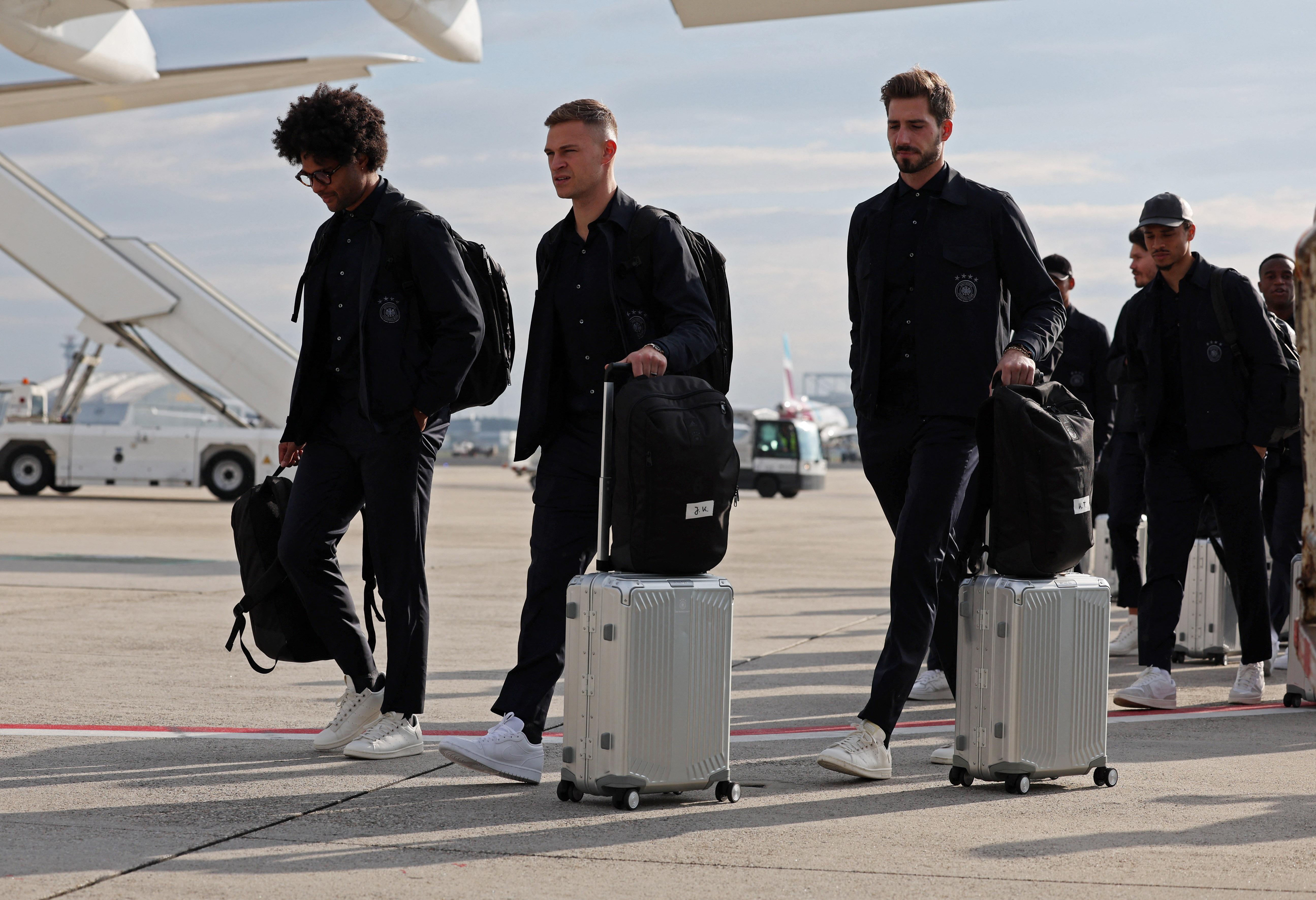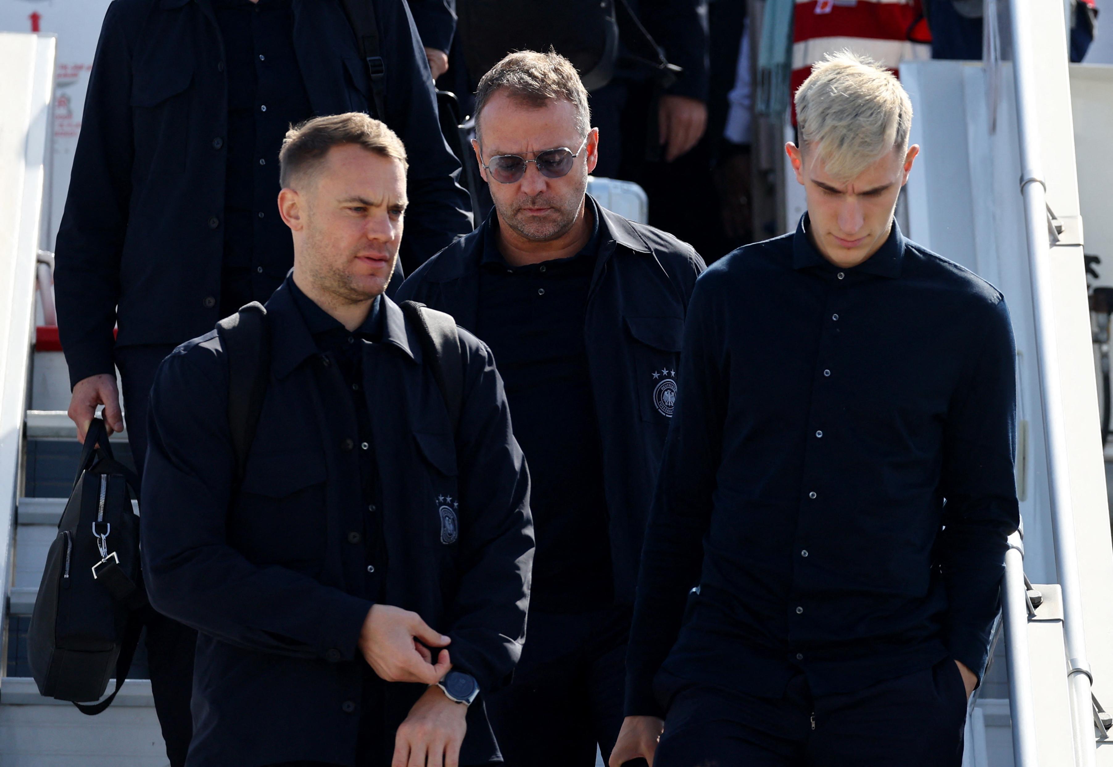 诺伊尔(左)、弗里克(中)、施洛特贝克(右)走下飞机。
