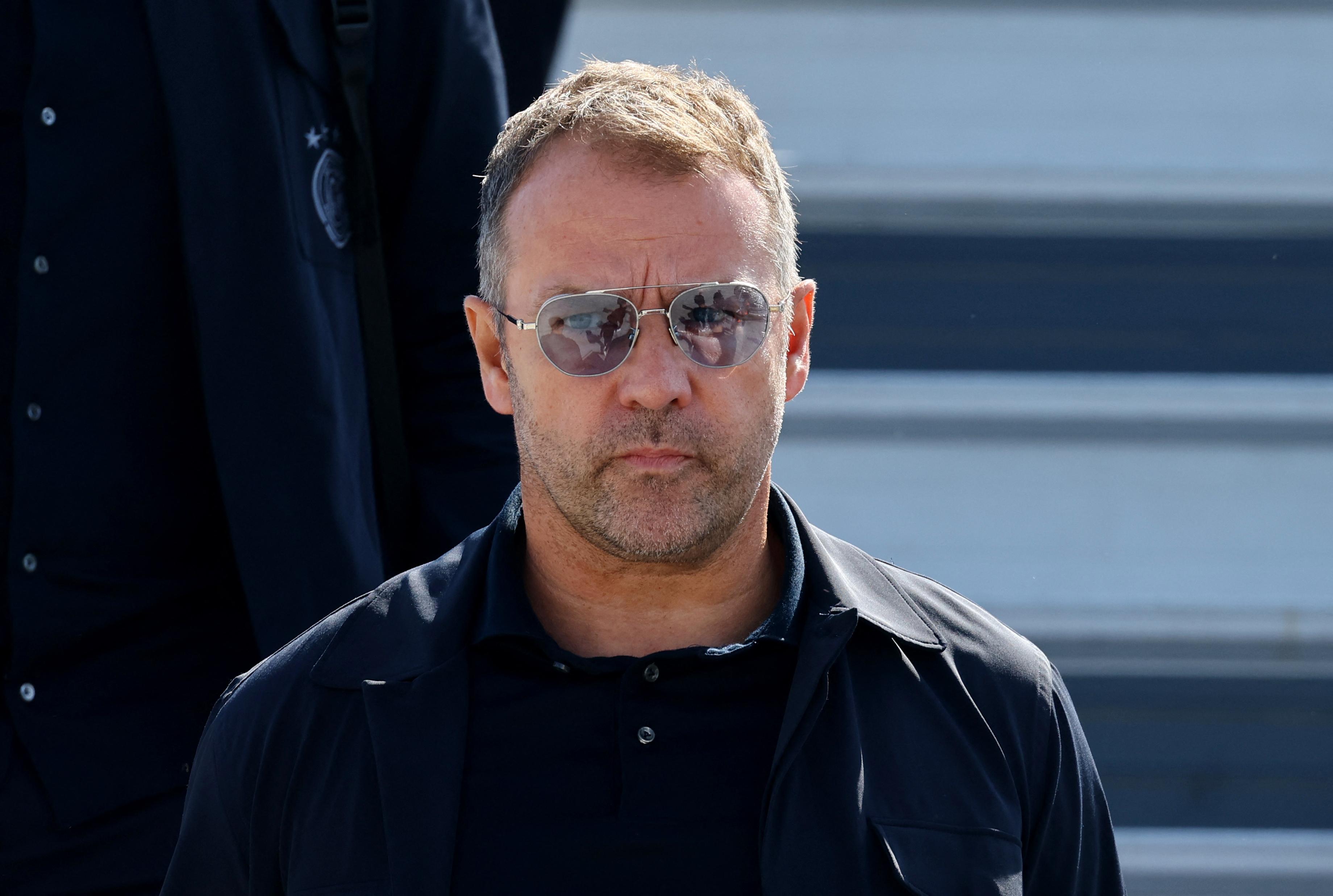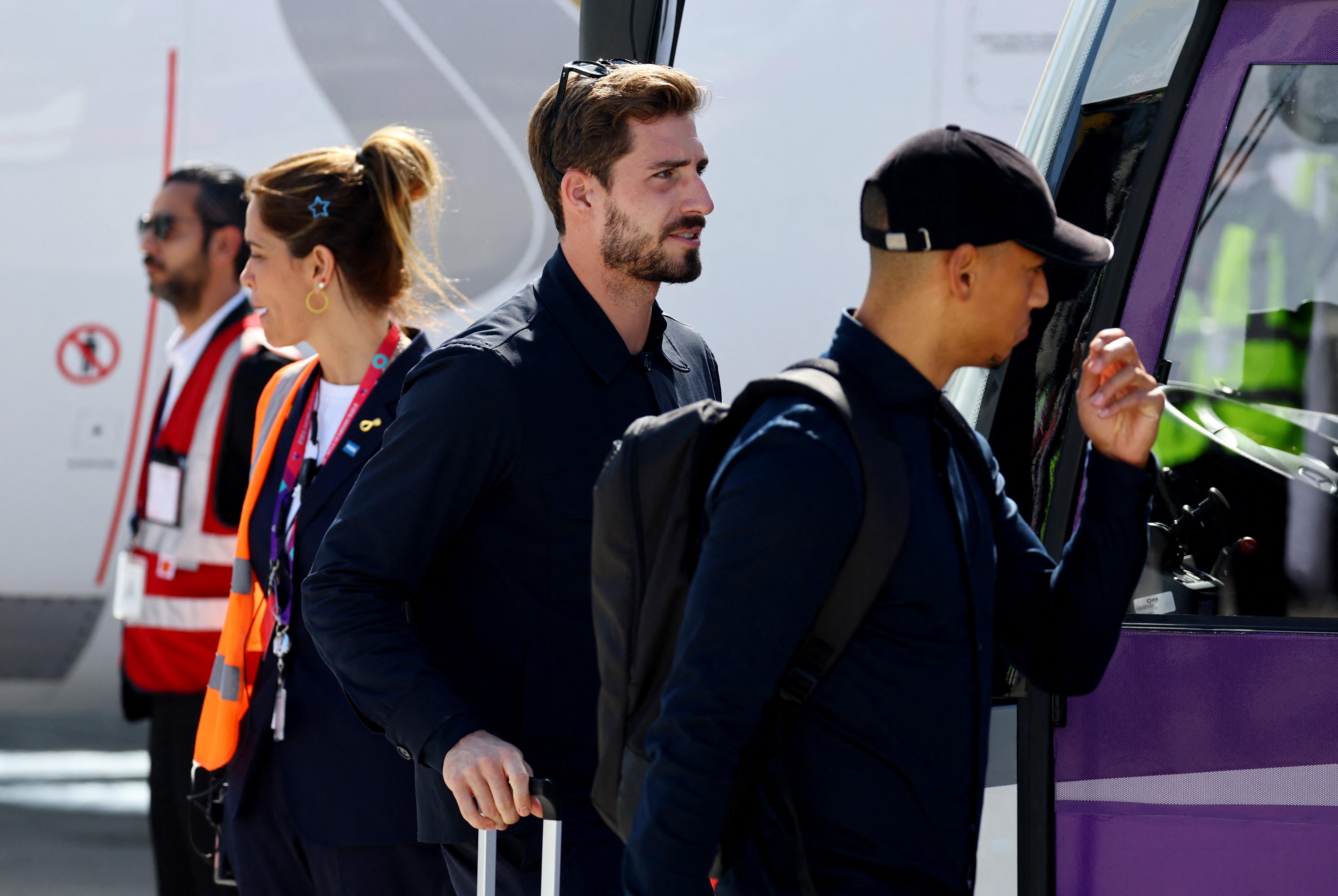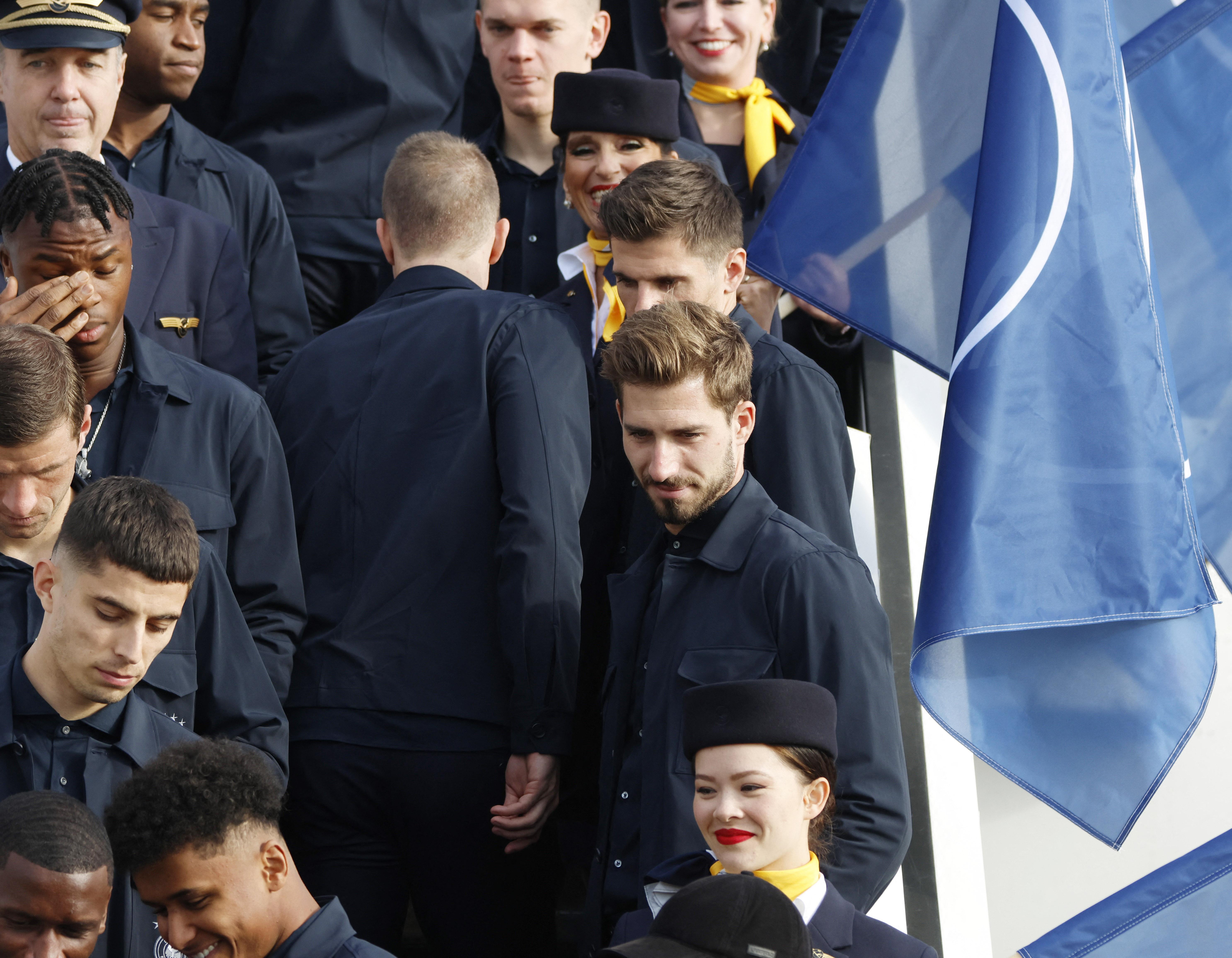 诺伊尔(左)、弗里克(中)、施洛特贝克(右)走下飞机。