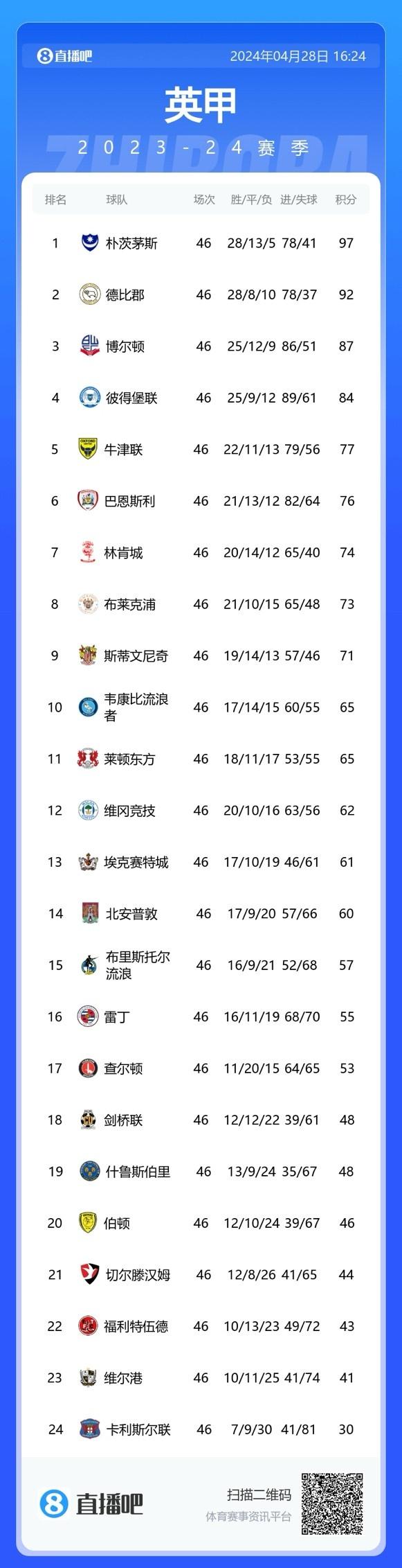 直播吧4月28日讯 2023-24赛季英甲结束常规赛季争夺,朴茨茅斯和德比郡直升英冠。