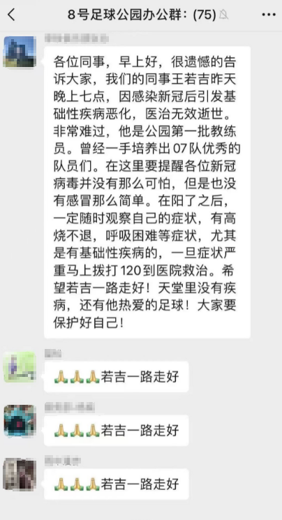 根据德国《转会市场》中国区管理员的消息,前沈阳金德队球员王若吉因感染新冠引发基础性疾病恶化,不幸于12月12日去世,年仅37岁。王若吉曾经是一名职业球员,效力过沈阳金德,退役后,王若吉在沈阳从事青训方面的教练工作。