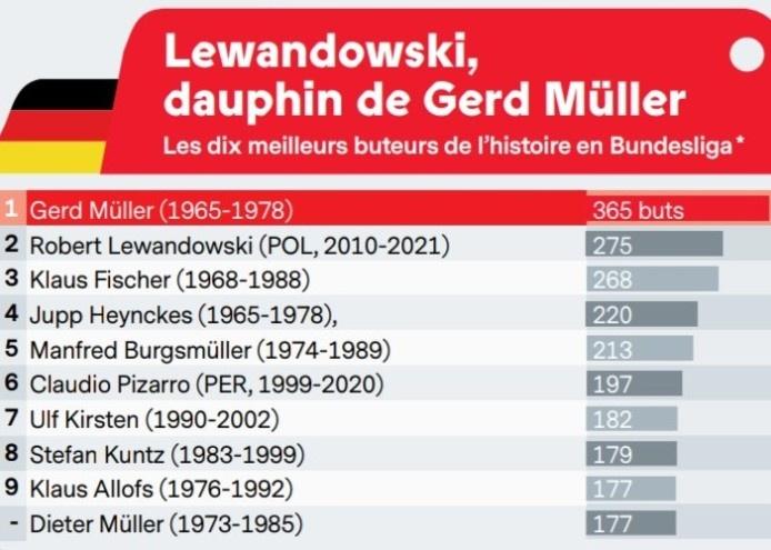 根据《法国足球》统计的数据,莱万还需要打进90球才能追上老穆勒的总进球纪录。前十名中还包括了拜仁前主帅海因克斯和旧将皮萨罗。
