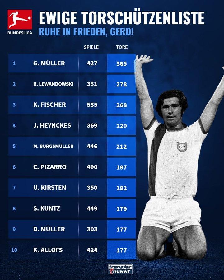 直播吧8月15日讯 德国足坛名宿盖德-穆勒去世,德国转会市场网站在社交媒体上列出德甲历史射手榜,以另一种方式缅怀这位传奇射手。