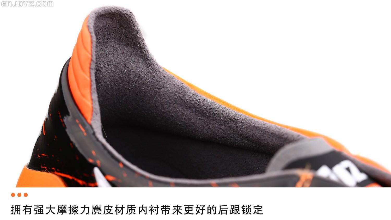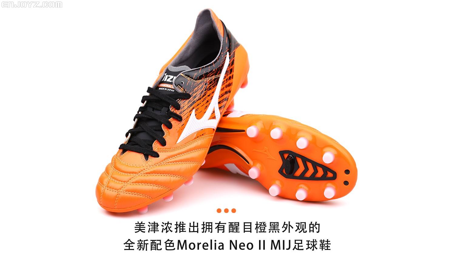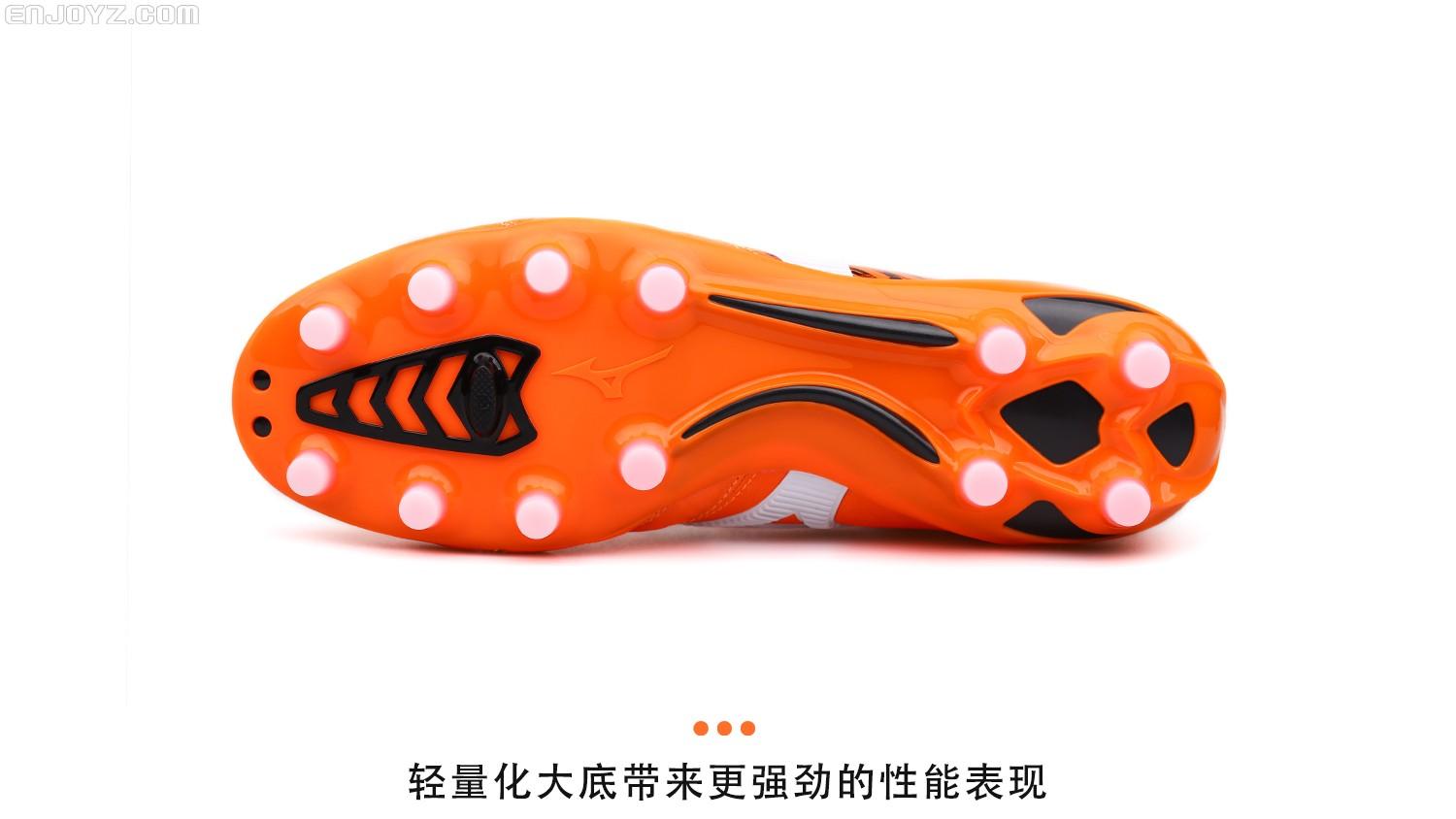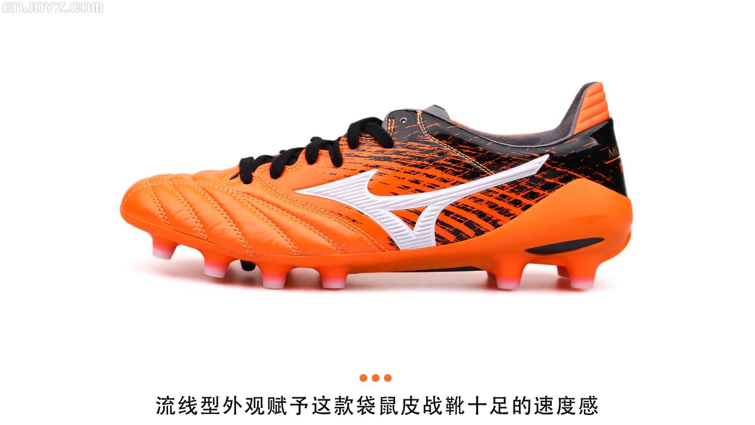 在保留Morelia经典元素的同时拥有更具速度感的流线型外观,如果将Morelia II比作高级豪华轿车的话,那么更注重球鞋轻量化和速度表现的Morelia Neo II就是一台对速度充满渴望的超级跑车。在保留触感真实的袋鼠皮鞋面的同时采用超轻尼龙大底让这一传统系列战靴能够跟上球鞋轻量化的大潮。橙色外观设计则让它在冬季赛场上格外醒目,抛开球鞋性能,单凭这个配色就能迷倒一票日系玩家。