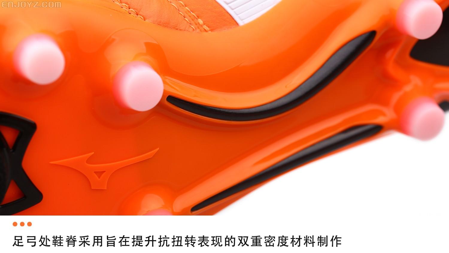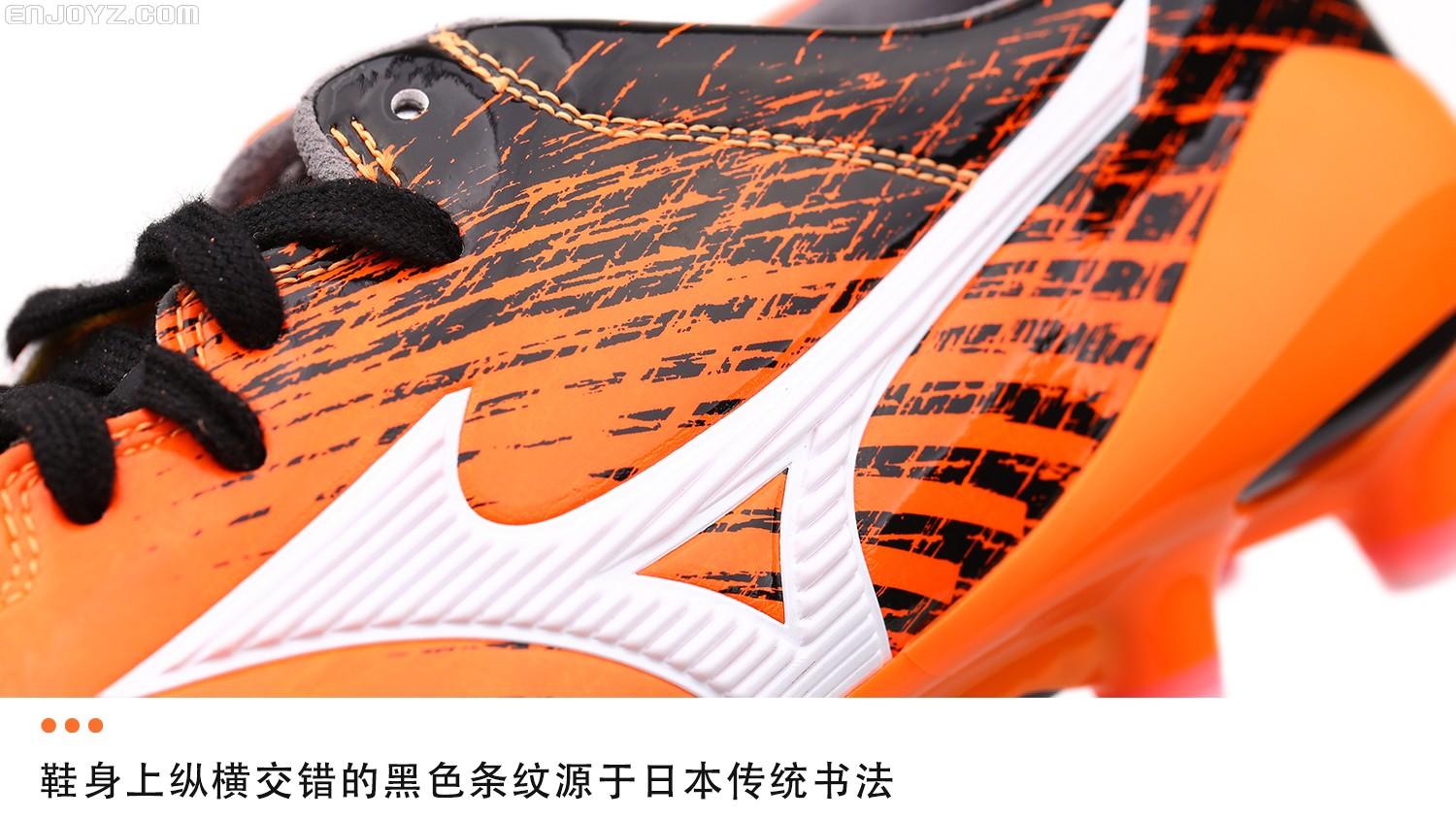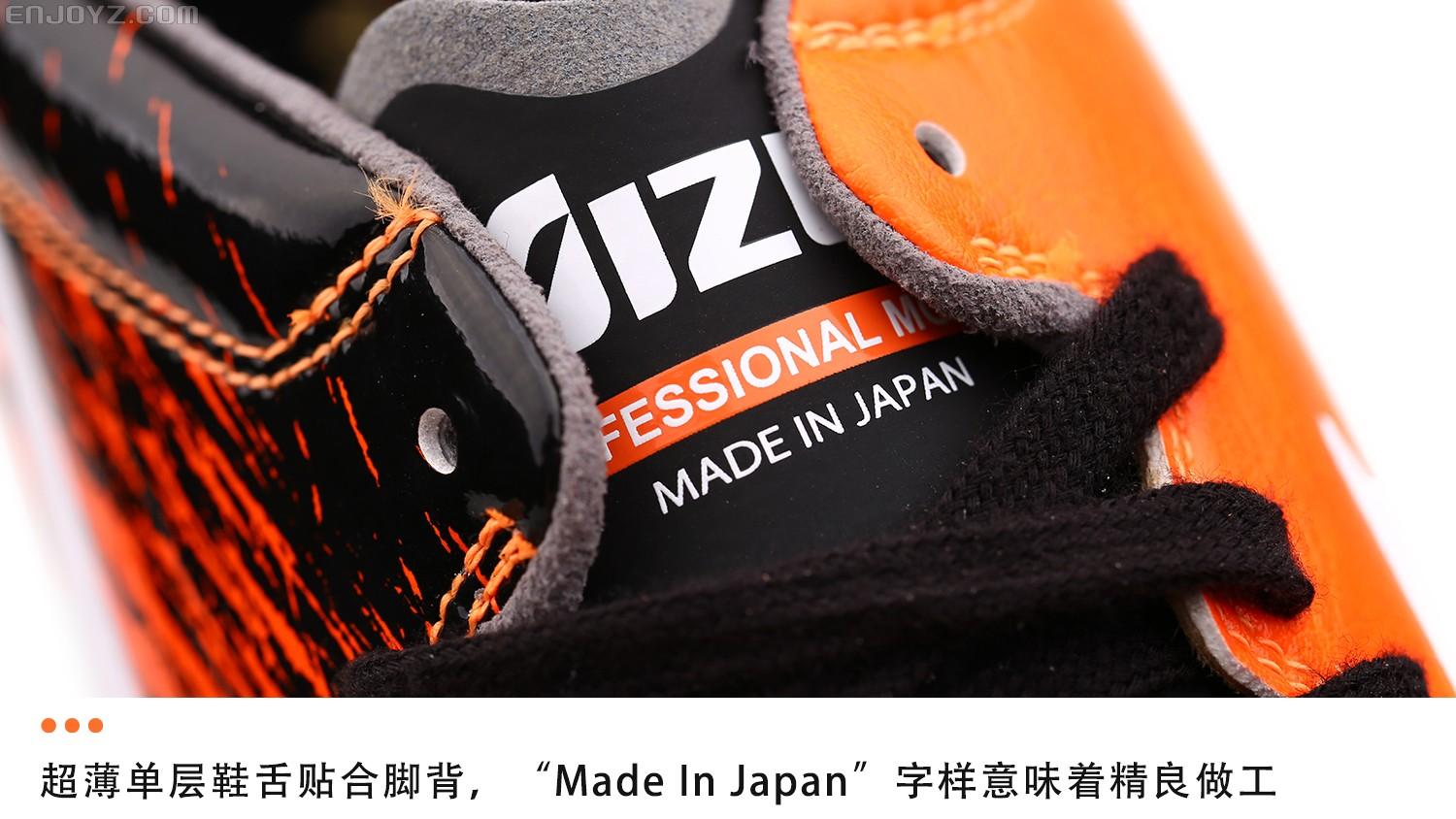 除了亮眼配色和独具日本文化特色的设计外,日系战靴一贯值得称道的细节设计在这款战靴上同样得以体验。轻薄的单层鞋舌带来更舒适贴合的穿着感受,鞋带系带孔采用全新波浪形设计,在鞋面弯折时能够始终贴合脚背。麂皮材质内衬能够有效锁定后跟,避免双脚在球鞋中打滑。当然,鞋舌上醒目的“Made In Japan”字样提醒着人们这款战靴代表了Mizuno足球鞋最高品质。处理优秀的皮质和精湛的做工让你心甘情愿地为其一掷千金。