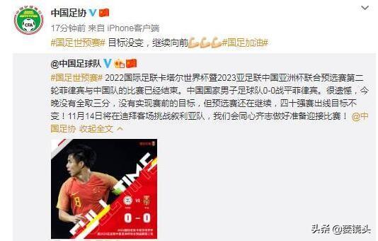 尽管如此,中国足球队官方依然表示,40强赛出线目标不会改变:“中国国家男子足球队0-0战平菲律宾。很遗憾,今晚没有全取三分,没有实现赛前的目标,但预选赛还在继续,四十强赛出线目标不变!11月14日将在迪拜客场挑战叙利亚队,我们会同心齐志做好准备迎接比赛!”