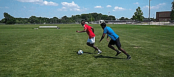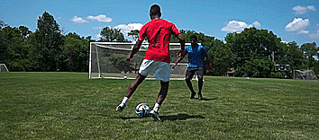 我们正在带球奔跑,防守者在追赶或者与我们并驾齐驱,把脚抬到空中,这个小动作会让对手停下来,对手不知道我们是否会停下来,或者是否会转身,然后我们继续向前冲刺。