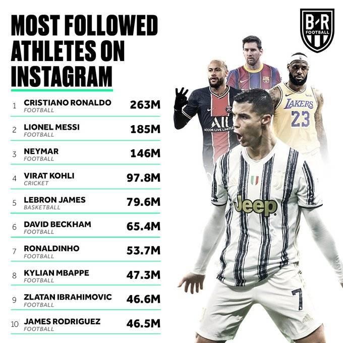 直播吧2月20日讯 B/R统计了最新的运动员INS粉丝数并排出前10名,C罗、梅西、内马尔仍分列前三。