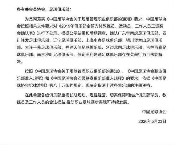 辽宁足球俱乐部和大连千兆足球俱乐部的境遇相似,在上赛季球队都遭遇了经营上的困难,球队资金难以为继,球员也面临长达数月的欠薪,球队也是在踉踉跄跄中完成了整个赛季。今日,中国足协正式发出公告:根据公示结果和后期调查,确认辽宁足球俱乐部、大连千兆足球俱乐部等11家俱乐部存在欠薪行为且未能解决,根据相应准入规程和纪律准则,现决定取消上述俱乐部的注册资格。