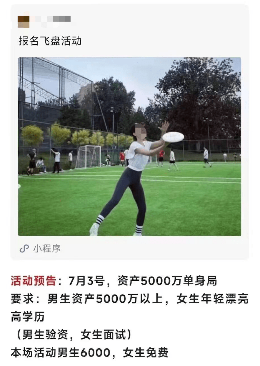 在这个过程中,也会出现一些“虽然这拿着盘,但全程无运动”拍照吸睛的流量博主,但更为夸张的,是看上了飞盘的流量而来蹭局的相亲活动。